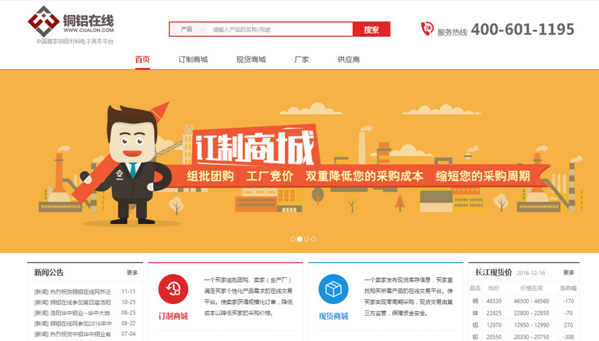 銅鋁在線為有色金屬行業(yè)的電子商務(wù)交易平臺(tái),采用系統(tǒng)自動(dòng)組批團(tuán)購(gòu)的方式,將需求相同的客戶組批給統(tǒng)一廠家競(jìng)價(jià),以組團(tuán)形式在降低買(mǎi)家采購(gòu)成本的同時(shí)降低工廠的生產(chǎn)成本。平臺(tái)同時(shí)提供現(xiàn)貨采購(gòu)模式,供用戶實(shí)現(xiàn)快速線上交易。